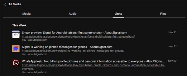 Met dit nieuwe mediaoverzicht biedt Signal Desktop een overzichtelijkere manier om gedeelde content snel terug te vinden.