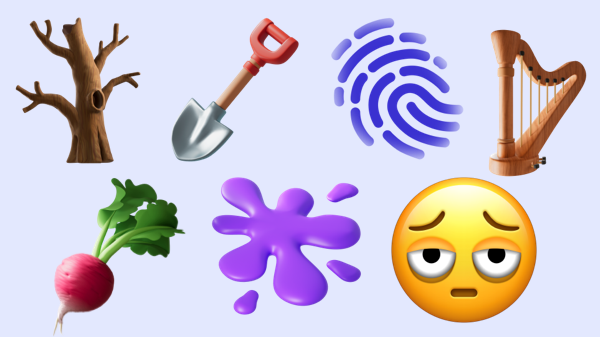 De nieuwe emoji zijn een vermoeid gezicht met wallen onder de ogen, vingerafdruk, kale boom, schep, radijs, een paarse spetter en een harp.
