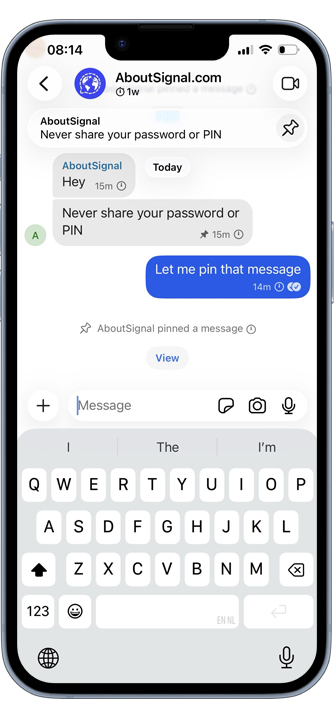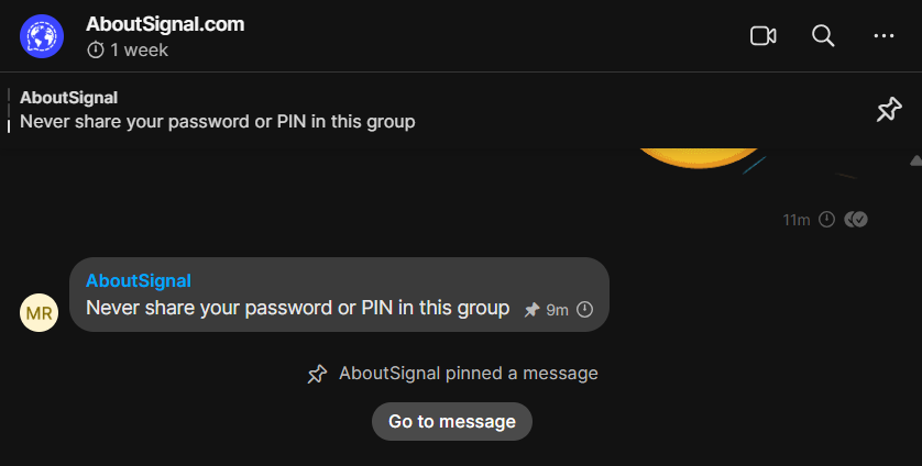 Het vastgezette bericht verschijnt vervolgens in een banner bovenin de Signal-chat. In de chat kun je vastgezette berichten herkennen aan het kleine punaise-icoontje naast de tijdstempel: