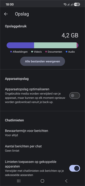 Zoals gezegd kun je je apparaatopslag alleen met de betaalde versie van Signal Secure Backups optimaliseren. De betaalde versie van Signal Secure backups kost € 1,99 per maand. De reden dat deze optie alleen in de betaalde versie beschikbaar is, is dat de gratis back-upversie slechts de laatste media van 45 dagen bevat en je dus ook geen oudere media kunt herstellen.