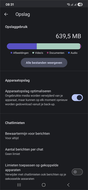 Als je liever toch weer al je media op je apparaat wilt opslaan, kun je de functie op ieder moment weer uit schakelen. Signal herstelt dan alle media weer uit je Signal Secure Backup.