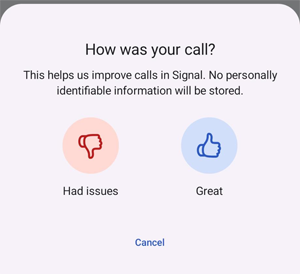 Om het bellen via Signal verder te verbeteren, heeft de app een feedbackpop-up voor oproepen geïntroduceerd. Door feedback te geven over je belervaring kan Signal de functie blijven verbeteren.