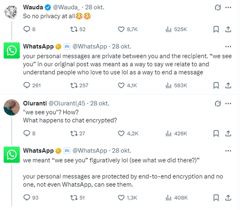 Nadat de social media manager bij WhatsApp zag dat de “grap” mislukte, haastte deze zich om te verdedigen. Hierbij deed WhatsApp hun welbekende trucje door het halve verhaal te vertellen: WhatsApp hamert erop dat berichten end-to-end versleuteld en privé zijn, maar zegt er niet bij dat ze veel andere dingen wél kunnen zien, zoals metadata.